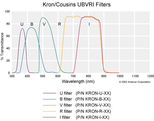 Examples of the Johnson/Bessel (left) and Kron-Cousin (right) UBVRI photometric are shown in Fig. 2. In the designation Andover P/N KRON-B-XX, the XX denotes the size. For example, a 50mm square would be KRON-B-50S (See Andover products for details)