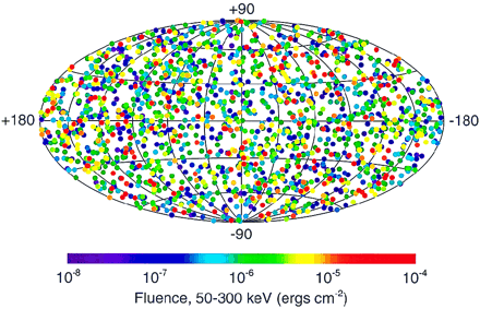 Un autre point intéressant sont les sursauts gamma. Ce sont les plus grandes explosions d'énergie de l'Univers de l'ordre de 1041 à 1048 Joules qui durent quelques secondes. En comparaison, il faudrait à notre Soleil 5 milliards d'années pour produire 6*1046 Joules. Ils sont répartis de manière plutôt uniforme sur le ciel (voir ci-dessous); ce qui implique que ce sont des événements extragalactiques (car sinon ils seraient concentrés dans le plan Galactique et le bulbe Galactique).